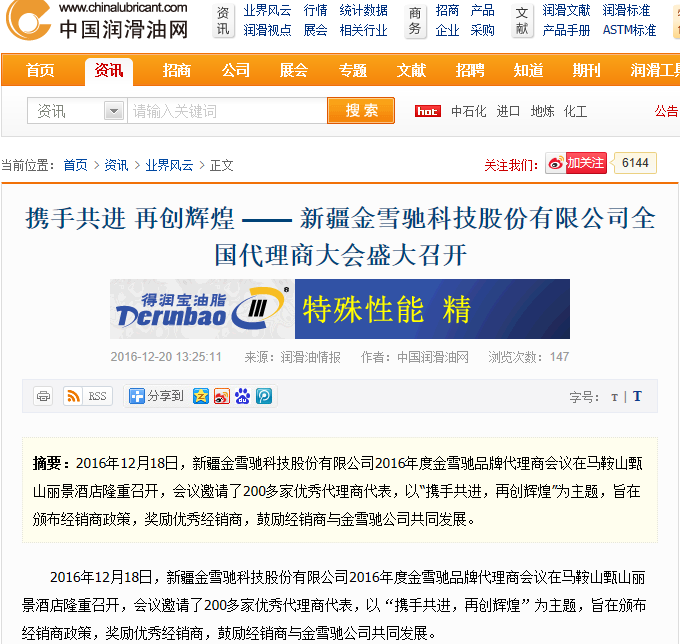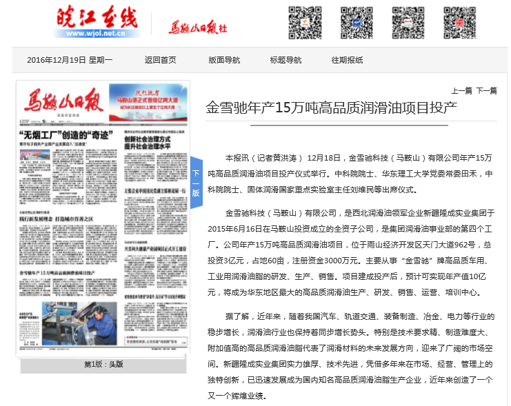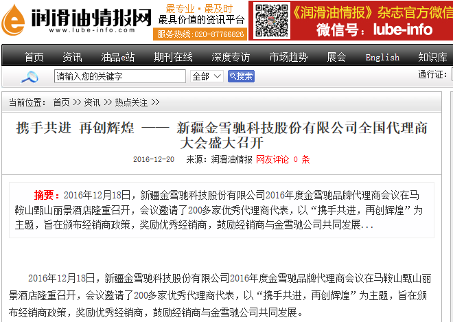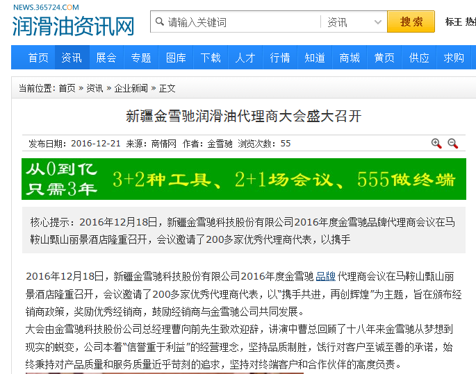 隨著金雪馳科技(馬鞍山)有限公司15萬(wàn)噸高品質(zhì)潤(rùn)滑產(chǎn)品項(xiàng)目的正式投產(chǎn)和2017年代理商大會(huì)的完美落幕,金雪馳品牌成為最近媒體關(guān)注的焦點(diǎn)。安徽日?qǐng)?bào)、馬鞍山日?qǐng)?bào)、中國(guó)化工報(bào)、安徽廣播電臺(tái)、馬鞍山電視臺(tái)、中國(guó)潤(rùn)滑油網(wǎng)、中國(guó)潤(rùn)滑油資訊網(wǎng)、中國(guó)潤(rùn)滑油情報(bào)網(wǎng)等新聞媒體第一時(shí)間進(jìn)行了宣傳報(bào)道。