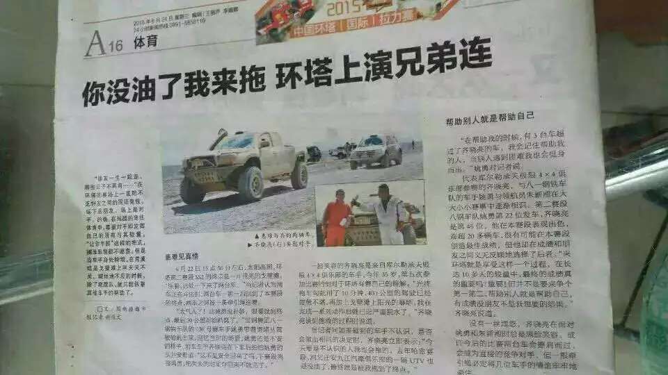 在環塔SS2賽段,來自金雪馳潤滑油助力的庫爾勒承天極限4×4俱樂部車手齊曉亮,將半路沒油的八一鋼鐵車隊的130號賽車手安全“拖”出了沙漠,挺身而出、不計較個人成績的堅毅品格,優秀的越野精神,感染了整個環塔賽場...