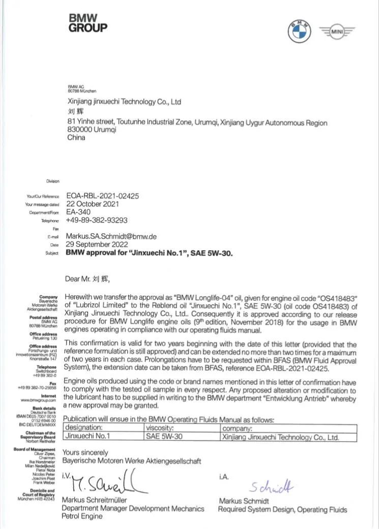 Jinxuezhi GOLD No.1 5W-30 gained the BMW Longlife-04 standard certification