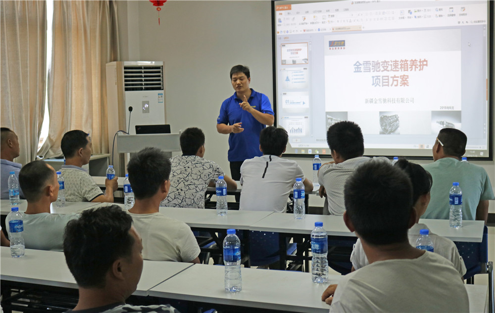 本次會議同時是金雪馳變速箱油系列的新品發布會。馬鞍山公司車用油處孫處長為大家講解了金雪馳變速箱產品的性能、特點、賣點,同時為大家總結了金雪馳變速箱油的推廣及售后知識,通過他的解說,大家對金雪馳變速箱油有了全面的了解,并對以后的新品推廣信心滿滿。