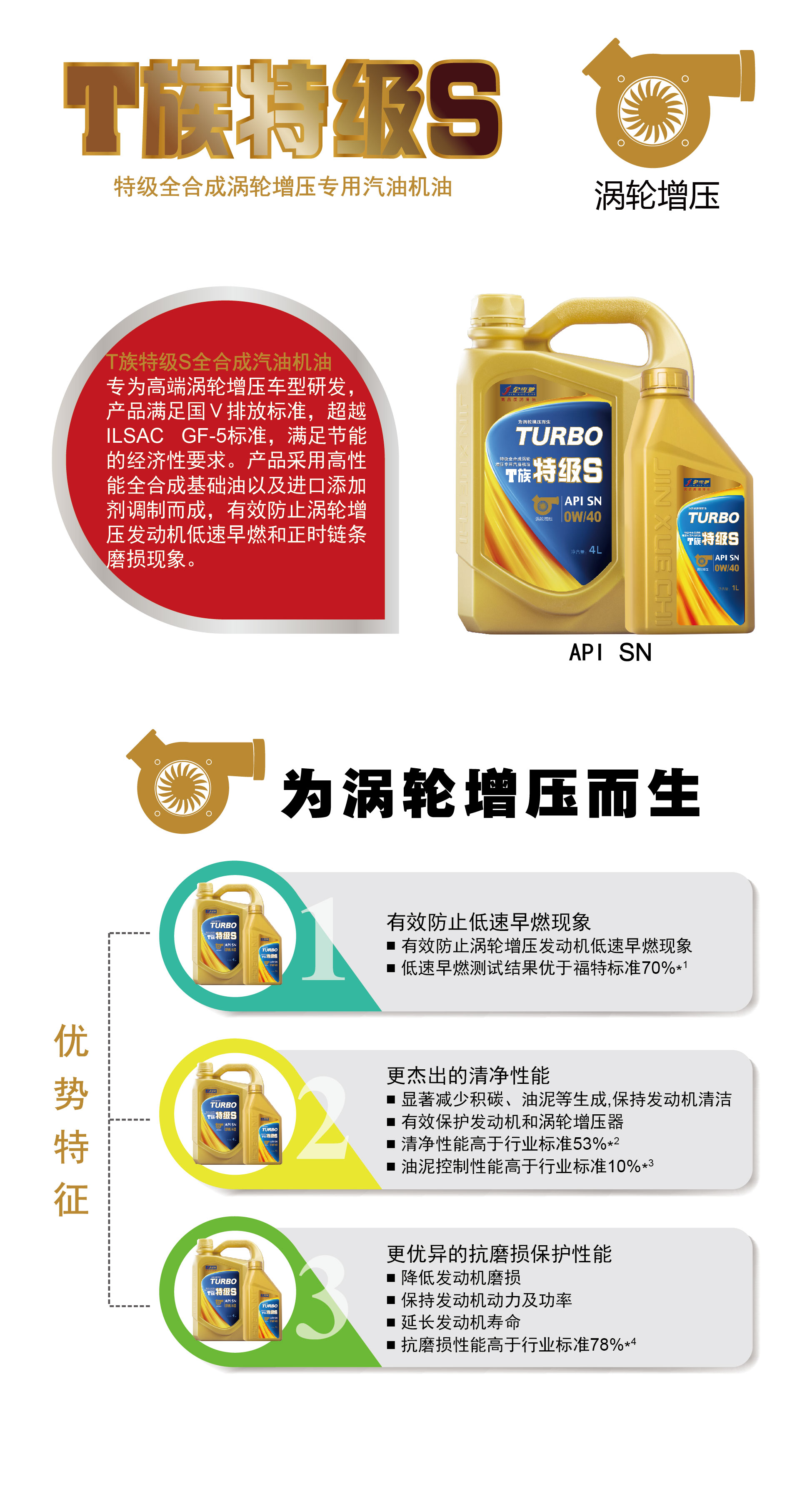 金雪馳此次推出的T族特級的升級產品——T族特級S全合成汽油機油,符合API SN PLUS技術規格要求,有效解決渦輪增壓發動機低速早燃和正時鏈條磨損問題,更好地保護發動機,延長發動機使用壽命。并且彌補了T族特級在高端渦輪增壓發動機中表現欠佳的問題,可滿足所有渦輪增壓發動機使用。