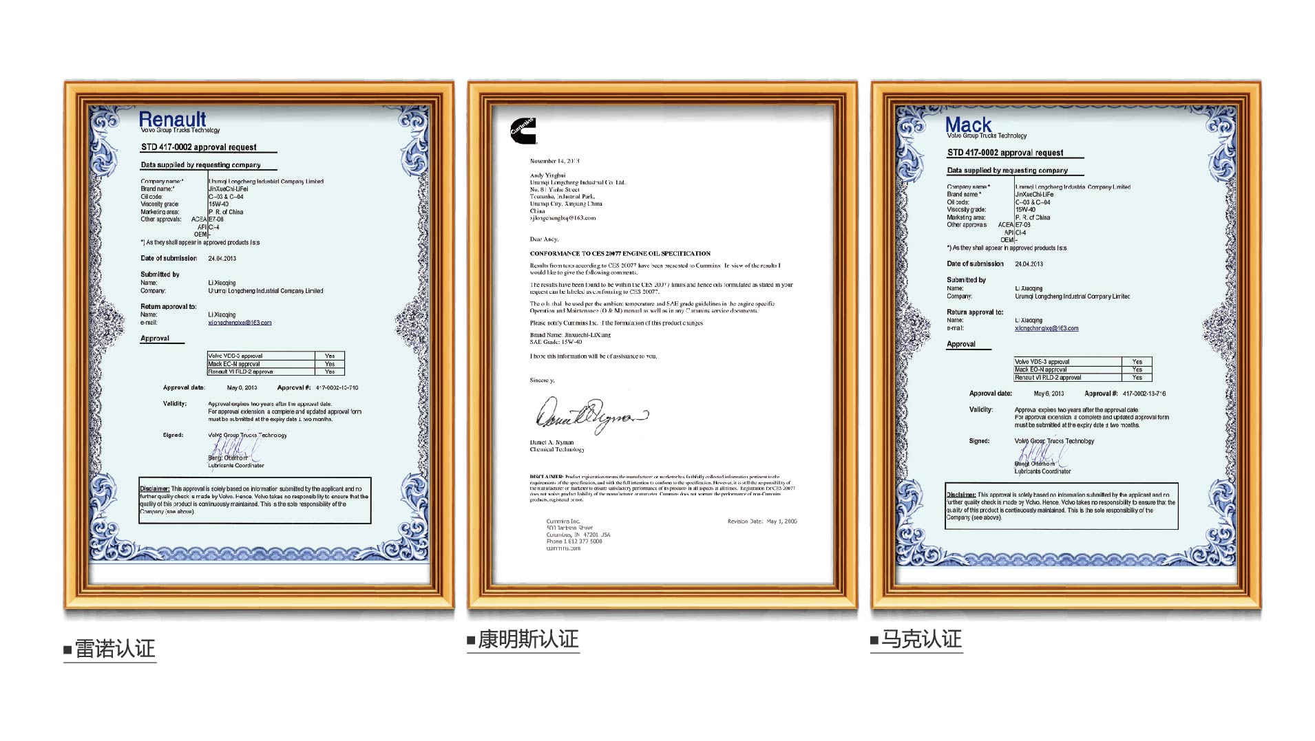 金雪馳高性能車用油通過了法國雷諾,美國康明斯,美國馬克等多家知名汽車廠商認證。