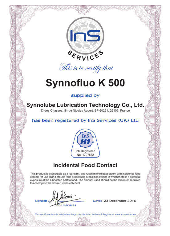 2016年12月23日,新疆金雪馳科技股份有限公司旗下的Synnofluo K 500、Synnofluo K 240兩項(xiàng)潤滑脂產(chǎn)品順利通過歐洲Ins的H1食品級認(rèn)證。食品級潤滑產(chǎn)品是指對人體無害的潤滑產(chǎn)品,可使用于食品、藥物等生產(chǎn)的制造設(shè)備上。金雪馳作為國內(nèi)為數(shù)不多通過Ins食品級潤滑產(chǎn)品認(rèn)證的民族潤滑油品牌,是金雪馳多年來注重產(chǎn)品的研發(fā)、高端產(chǎn)品的替代、節(jié)能環(huán)保產(chǎn)品的上市等方面努力的結(jié)果。
