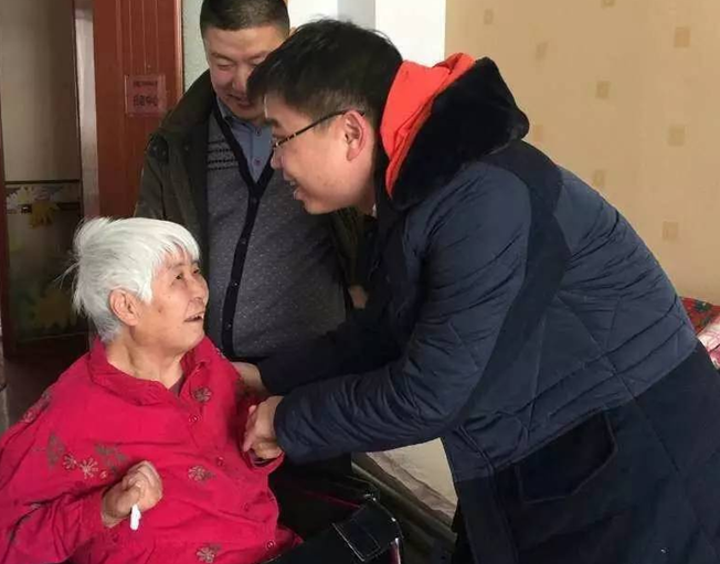 證券部經理成明、集團辦公室主任張偉親切與敬老院老人聊天。