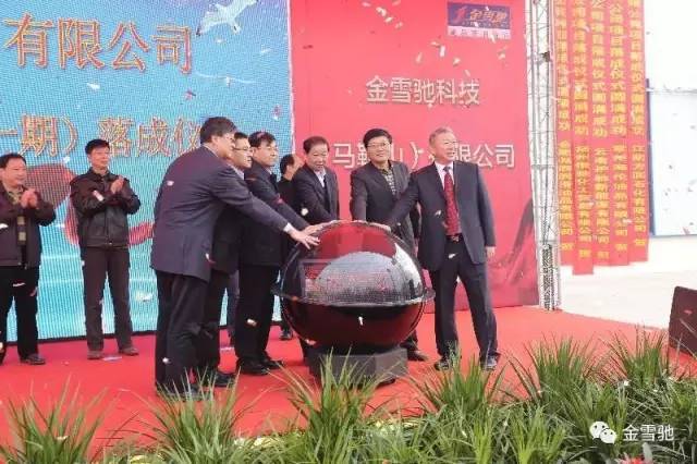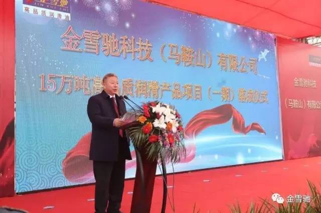 2016年12月18日上午,金雪馳科技(馬鞍山)有限公司15萬噸高品質潤滑油項目(一期)落成儀式在馬鞍山市隆重舉行。各級政府、科研院所、合作企業、社會各界代表近300人參加了本次落成慶典活動。由中科院院士、華東理工大學黨委常委田禾院士、中國科學院院士、固體潤滑國家重點實驗室主任劉維民院士、烏魯木齊市人民政府副市長張雪峰、馬鞍山市委副書記、市長左俊、馬鋼集團黨委常委、董事副總經理陸克從、新疆隆成實業集團董事長、新疆金雪馳科技股份有限公司董事長劉輝上臺,共同啟動了象征著金雪馳科技15萬噸高品質潤滑油項目落成的水晶球。