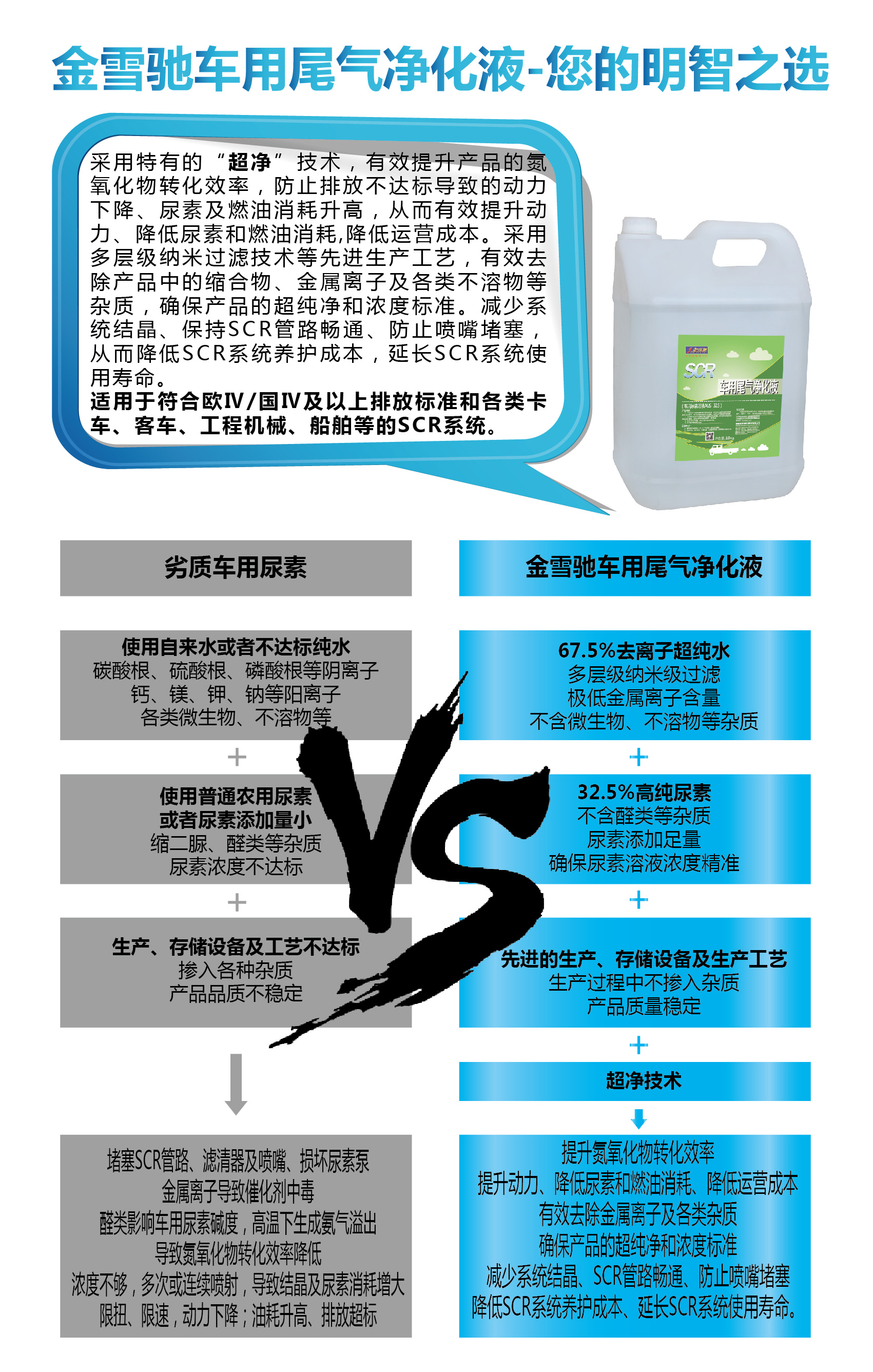 金雪馳車用尾氣凈化液,專用于符合歐Ⅳ/Ⅳ及以上排放標準的各類商用車、客車、特種車及大型工程機械車及船舶中的SCR系統。產品配方先進獨特,具有高效、持久、耐用功效,在柴油發動機中添加金雪馳研發的車用尾氣凈化液,可使車輛排出的氮氧化物污染濃度大幅降低。同時,產品攻克低溫技術,冬天-30℃不結晶,保障車輛在超低溫中正常啟動行駛。此外,金雪馳車用尾氣凈化液還突破商用車高油耗限制,其促使發動機燃燒效率更高,燃油消耗相比原來的發動機節省3%-5%,起到節能、減排之效。