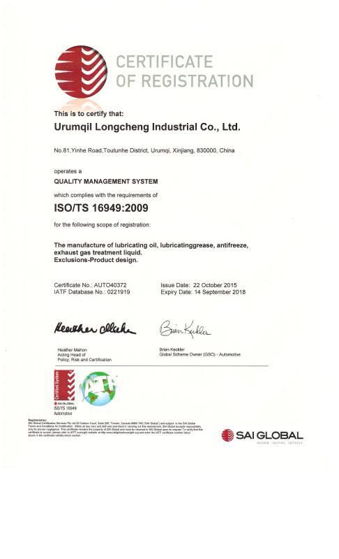 長期致力于建立以顧客需求為導(dǎo)向的質(zhì)量保障體系,烏魯木齊市隆成實(shí)業(yè)有限公司于近日榮獲ISO/TS 16949:2009質(zhì)量體系的認(rèn)證證書,成為少數(shù)獲得此認(rèn)證的民族潤滑油制造商,為金雪馳潤滑油進(jìn)一步與國內(nèi)外汽車制造商開展合作奠定了堅實(shí)基礎(chǔ)。