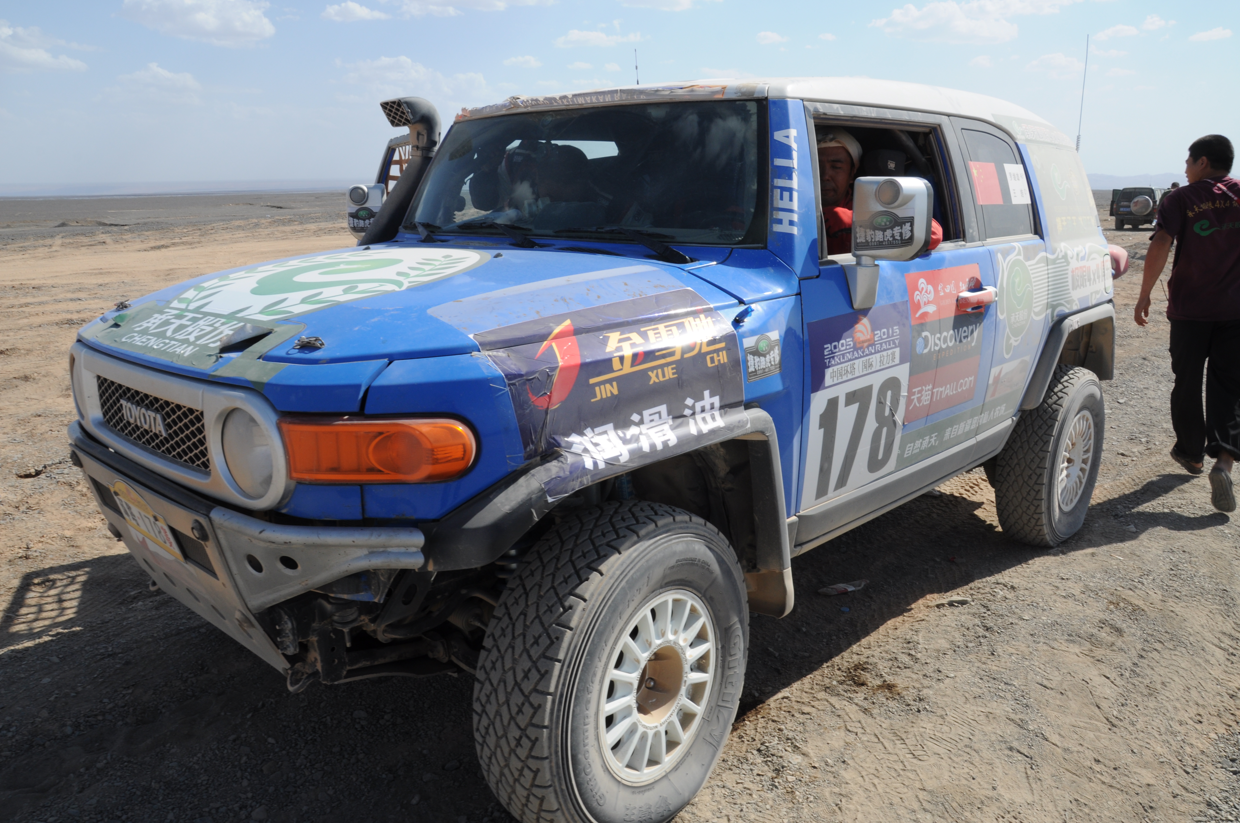 一臉笑容的齊曉亮是來自庫爾勒承天極限4×4俱樂部的車手,今年35歲,第五次參加比賽的他對于環(huán)塔有著自己的理解。“光掛拖車勾就用了10分鐘,400公里的駕駛已經(jīng)疲憊不堪,再加上戈壁灘上陽光的暴曬,我在完成一系列動作后就已近嚴重脫水了。”齊曉亮談到施救的過程時說道。