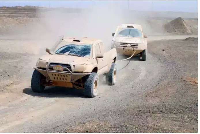6月22日15點50分左右,太陽高照,環(huán)塔第二賽段SS2的終點是一片荒蕪的戈壁灘。“快看,遠處一下來了兩臺車。”當記者認為兩車正在斗法時,兩臺車一前一后回到了本賽段的終點,兩車之間被一條牽引繩連著。