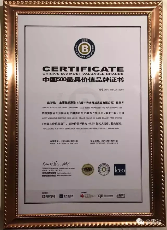 由世界品牌實(shí)驗(yàn)室(World Brand Lab)主辦的2015年“世界品牌大會(huì)”于6月16日在北京東方君悅大酒店隆重舉行,會(huì)上發(fā)布了2015年(第十二屆)《中國(guó)500最具價(jià)值品牌》排行榜,作為民族潤(rùn)滑油行業(yè)的領(lǐng)先品牌,金雪馳潤(rùn)滑油品牌價(jià)值為46.25億元,位居榜單第394位,這無疑是對(duì)金雪馳品牌的高度認(rèn)可,顯示出公司穩(wěn)健的經(jīng)營(yíng)實(shí)力和強(qiáng)勁的品牌競(jìng)爭(zhēng)力。