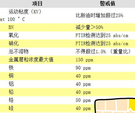 對于較大的天然氣發動機組,例如工業天然氣發動機,或者機油用量較大的系統、較為關鍵的發動機,最好通過油液檢測來指導換油。油液檢測不但能檢測油質,還能監控機組的異常,是預防天然氣發動機組故障的有效手段。發動機制造商會給出機油的換油指標,一般來說,天然氣發動機油的換油指標如下: